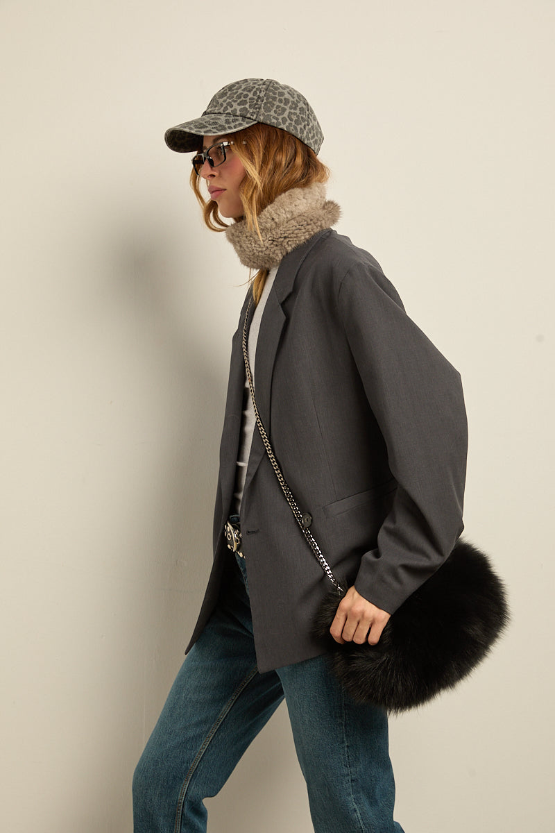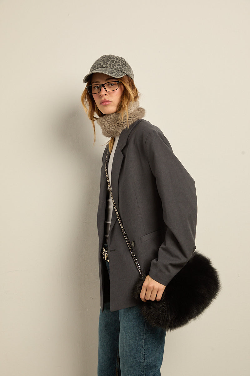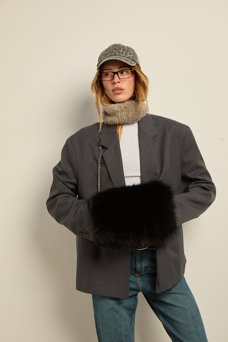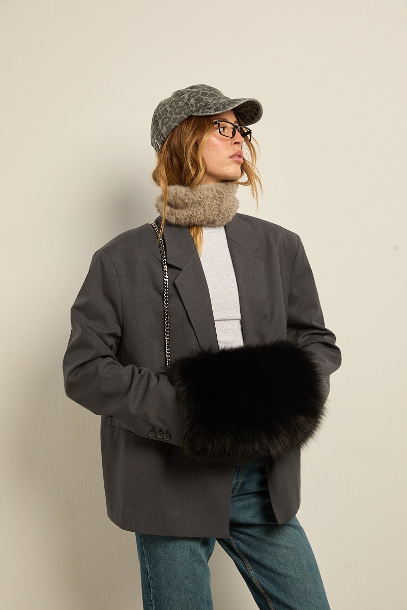 Bolso de zorro natural con agujeros en los laterales para introducir las manos a modo manguito. Cierre con cremallera y asa de tipo cadena de metal removible.