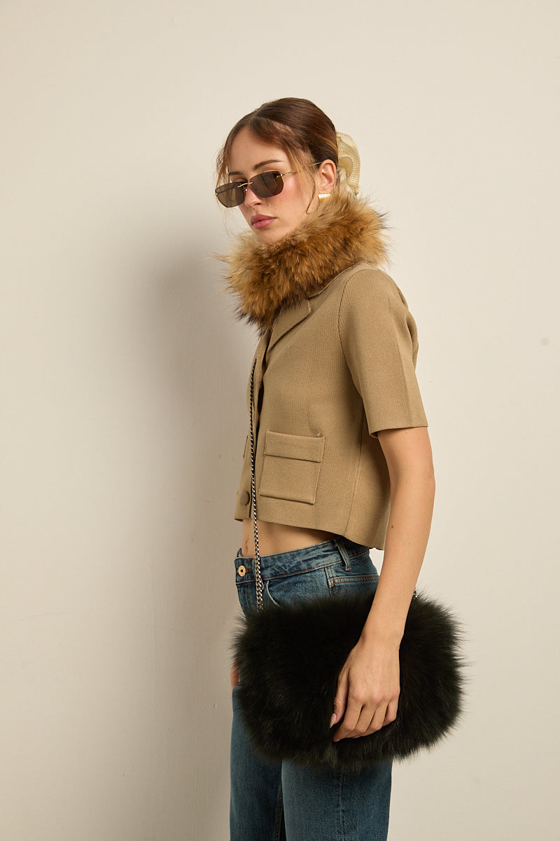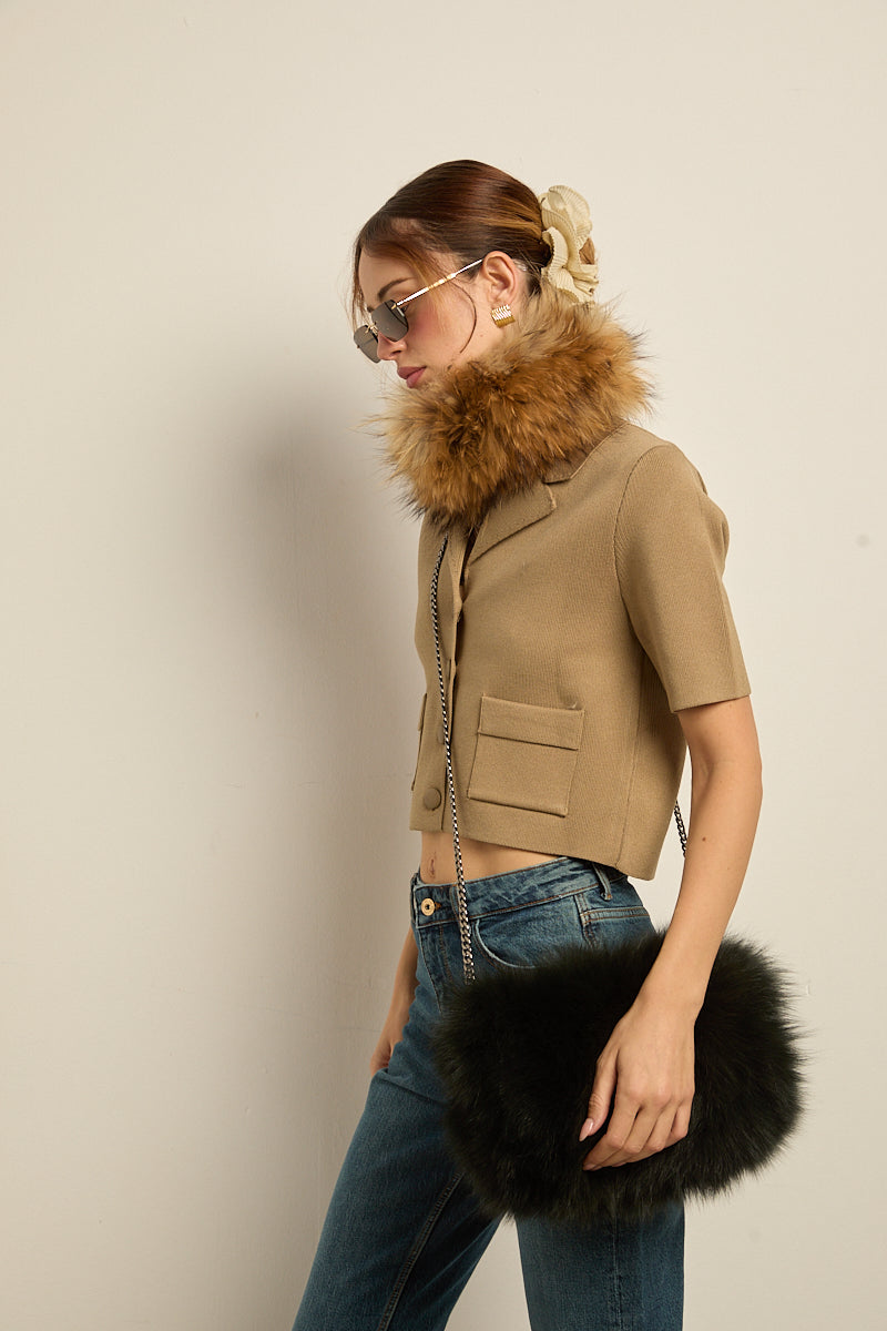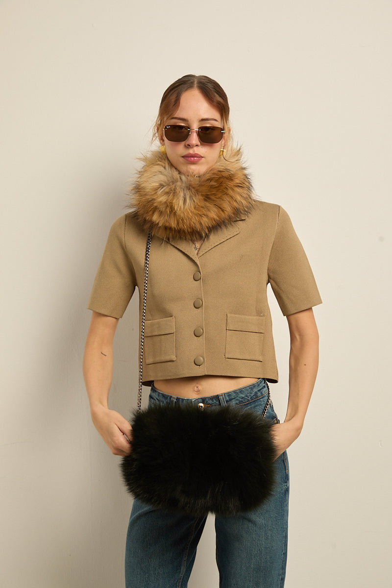 Bolso de zorro natural con agujeros en los laterales para introducir las manos a modo manguito. Cierre con cremallera y asa de tipo cadena de metal removible.