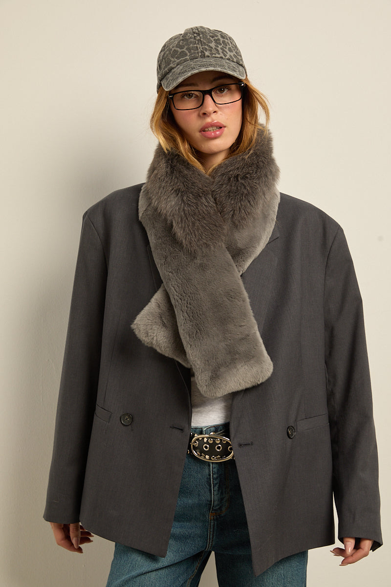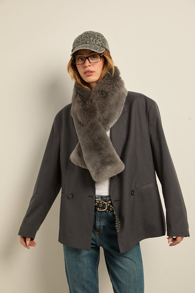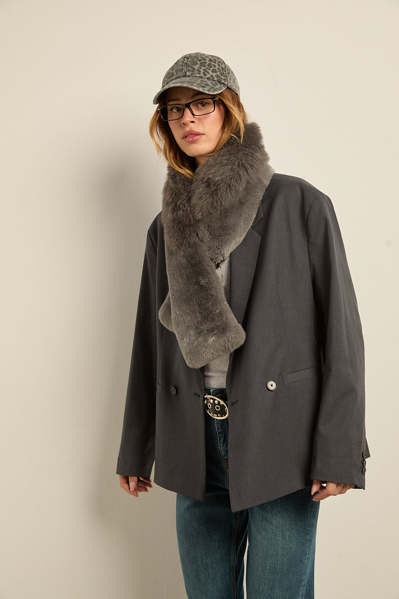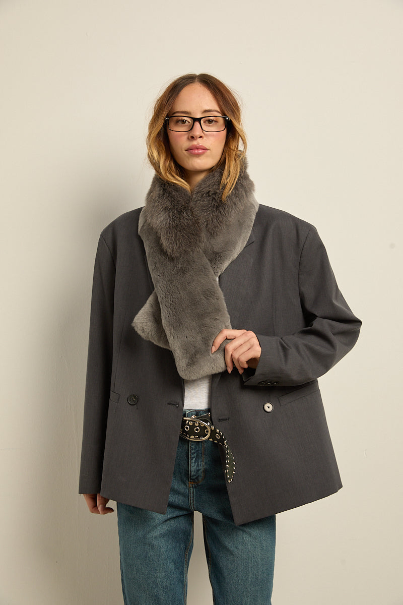 Bufanda de piel natural de rex con ribeteado de zorro color gris.