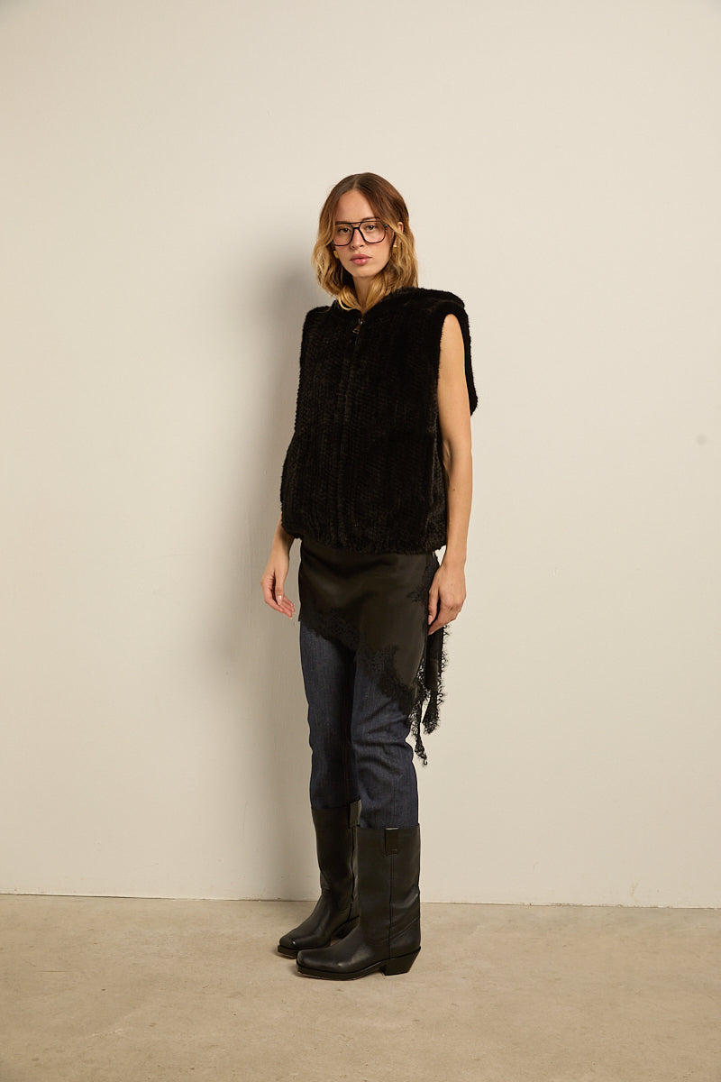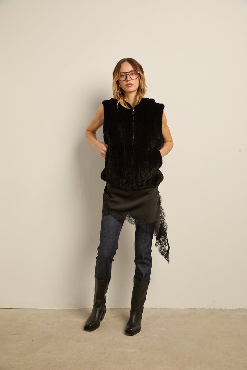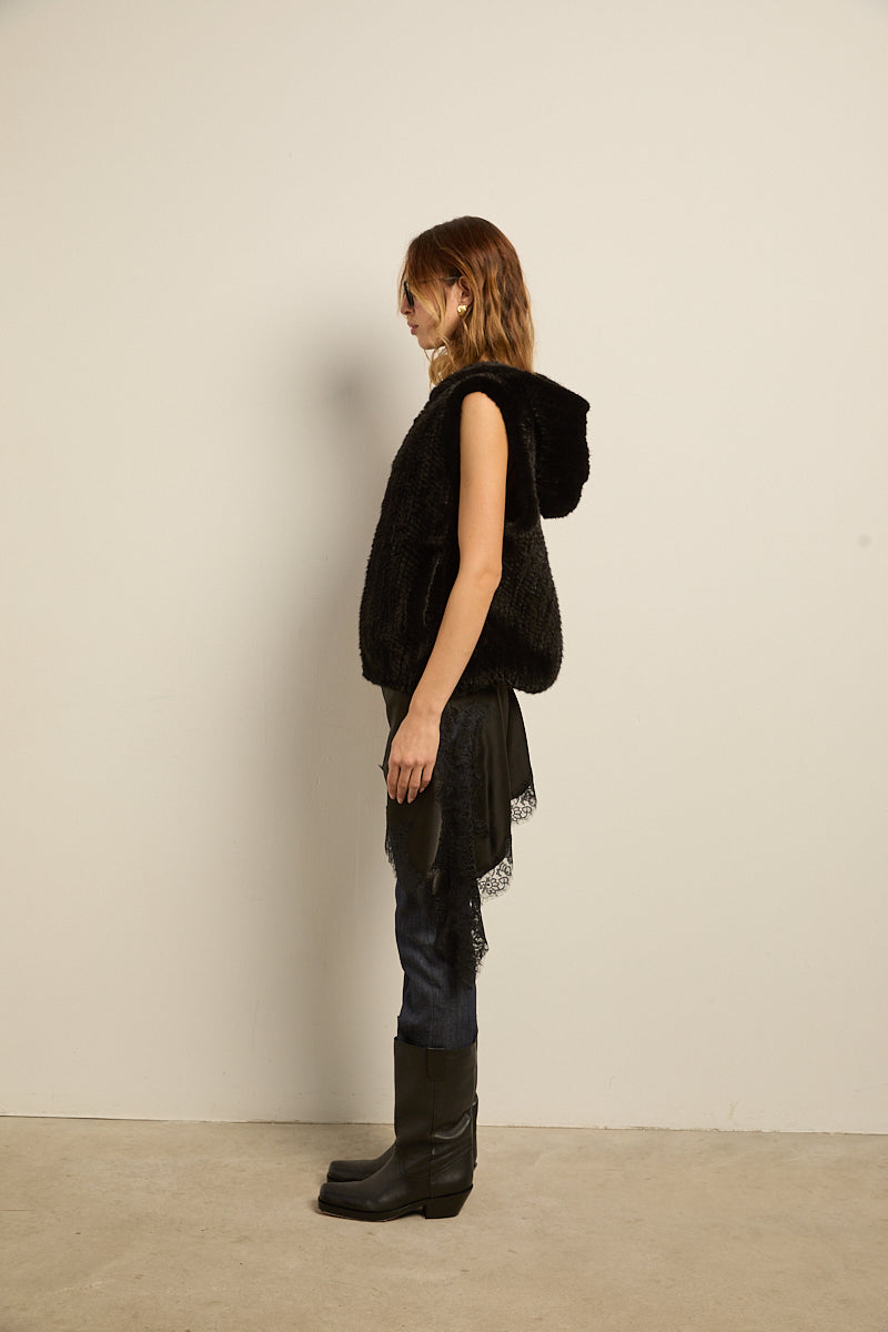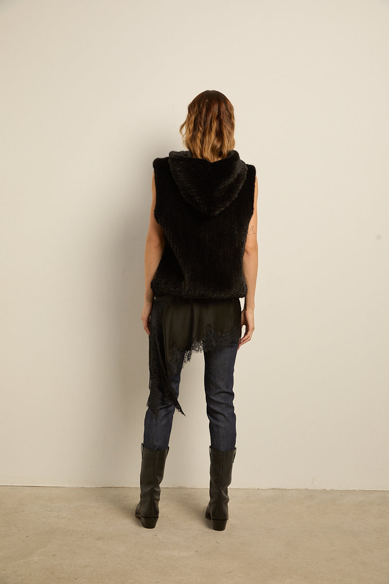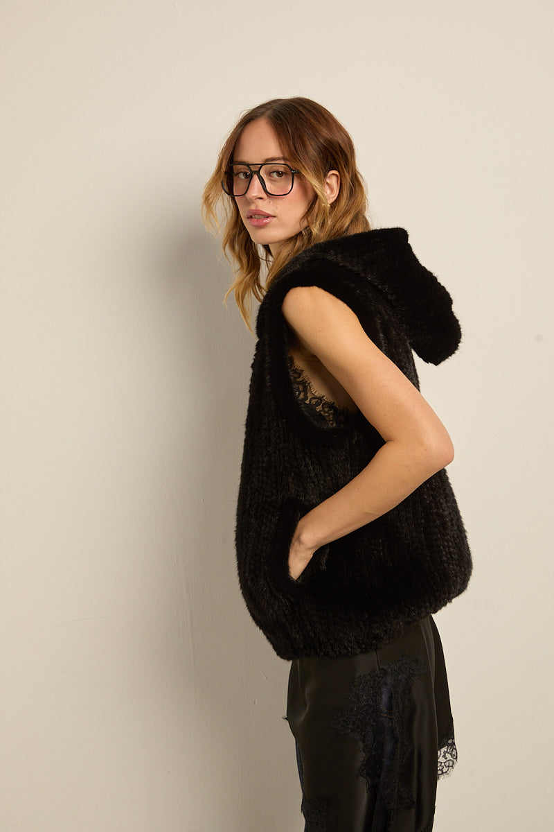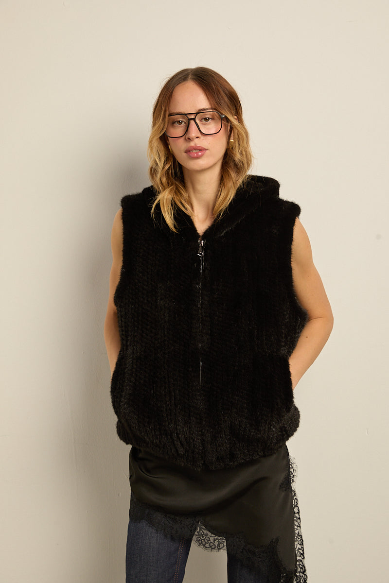 Chaleco con capucha de piel natural de visón tricotado color negro. Cierre con cremallera y bajo abullonado elástico. Bolsillos laterales.