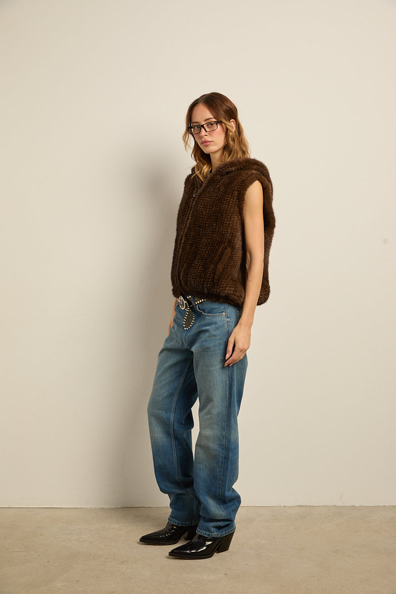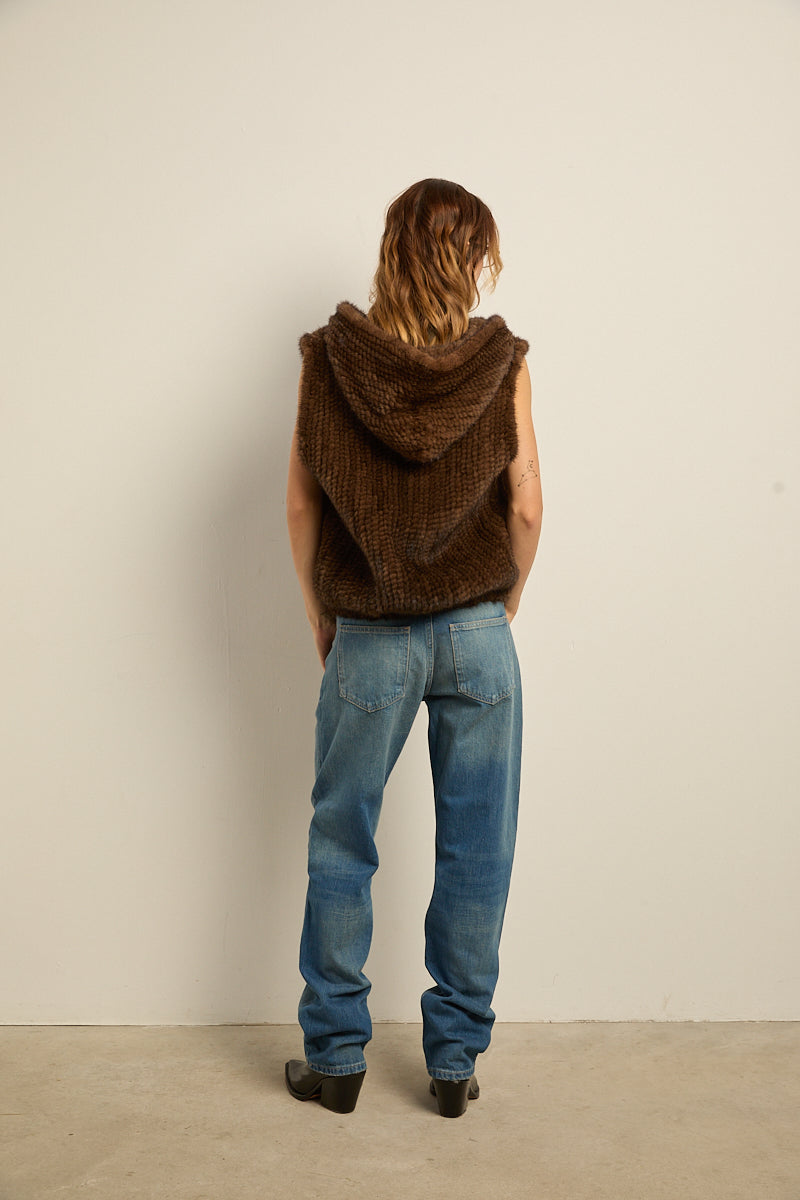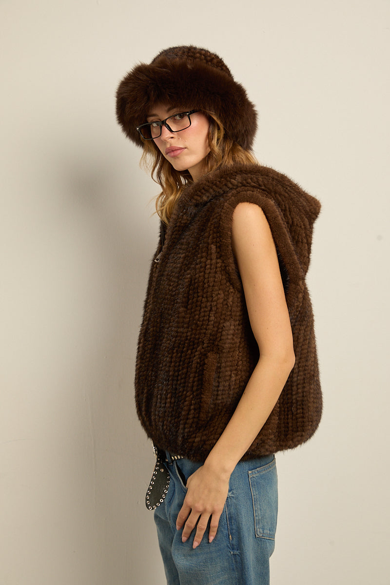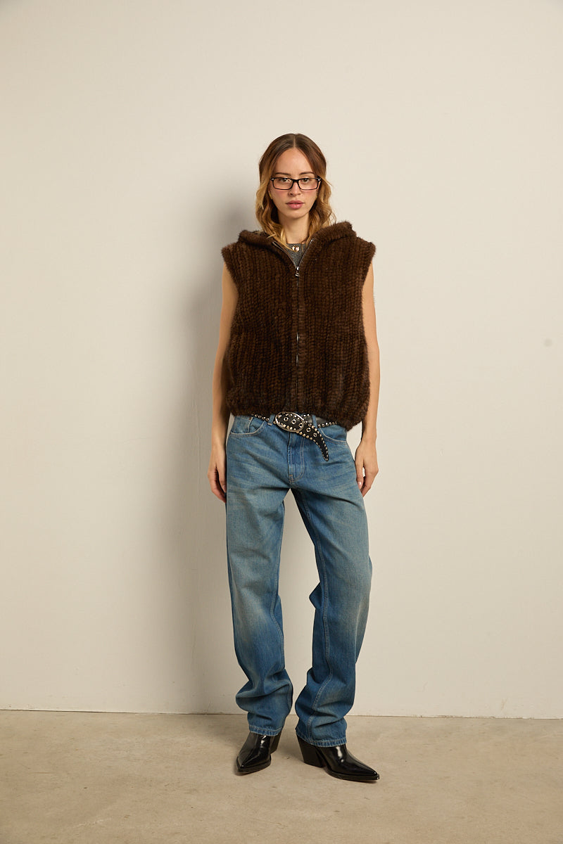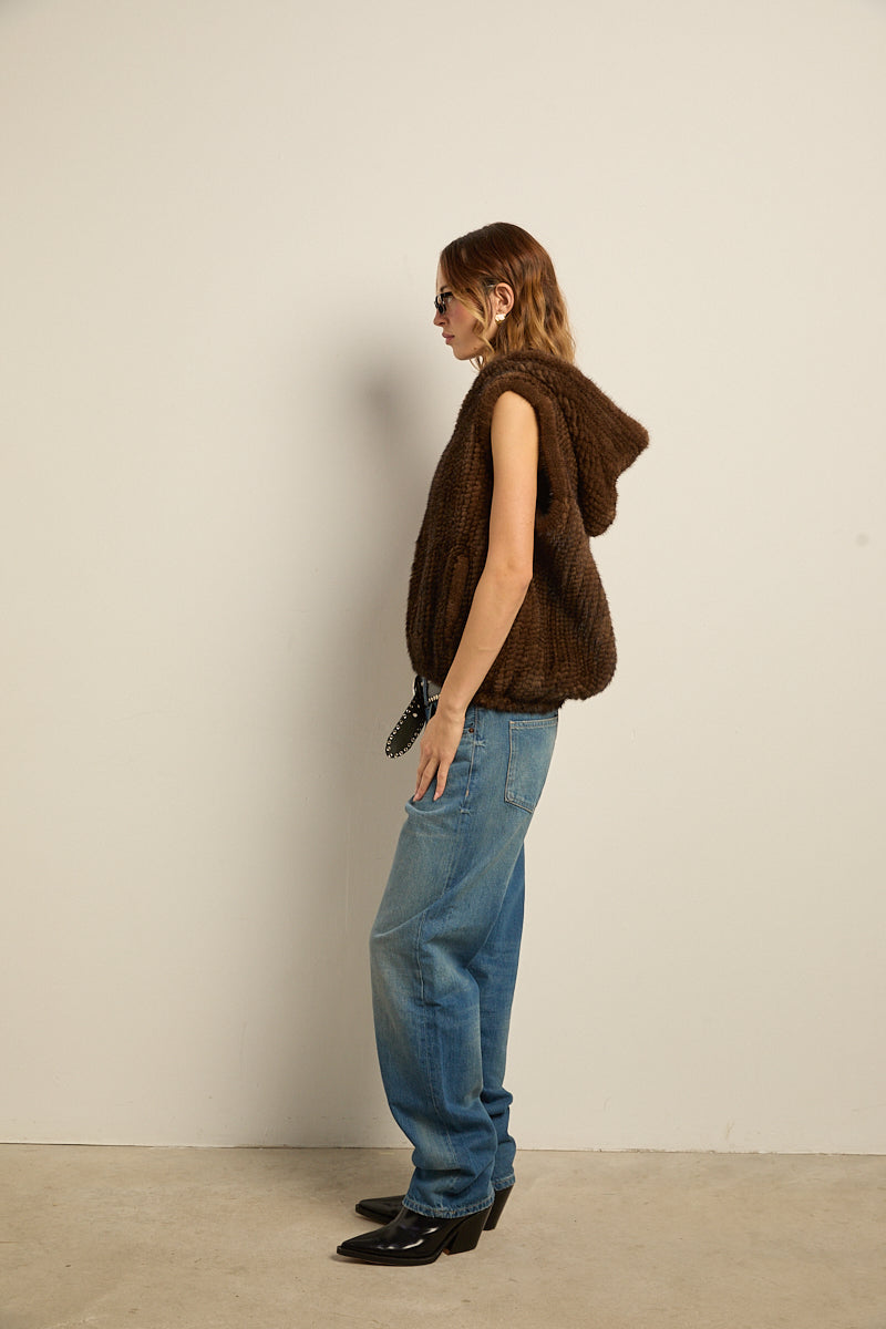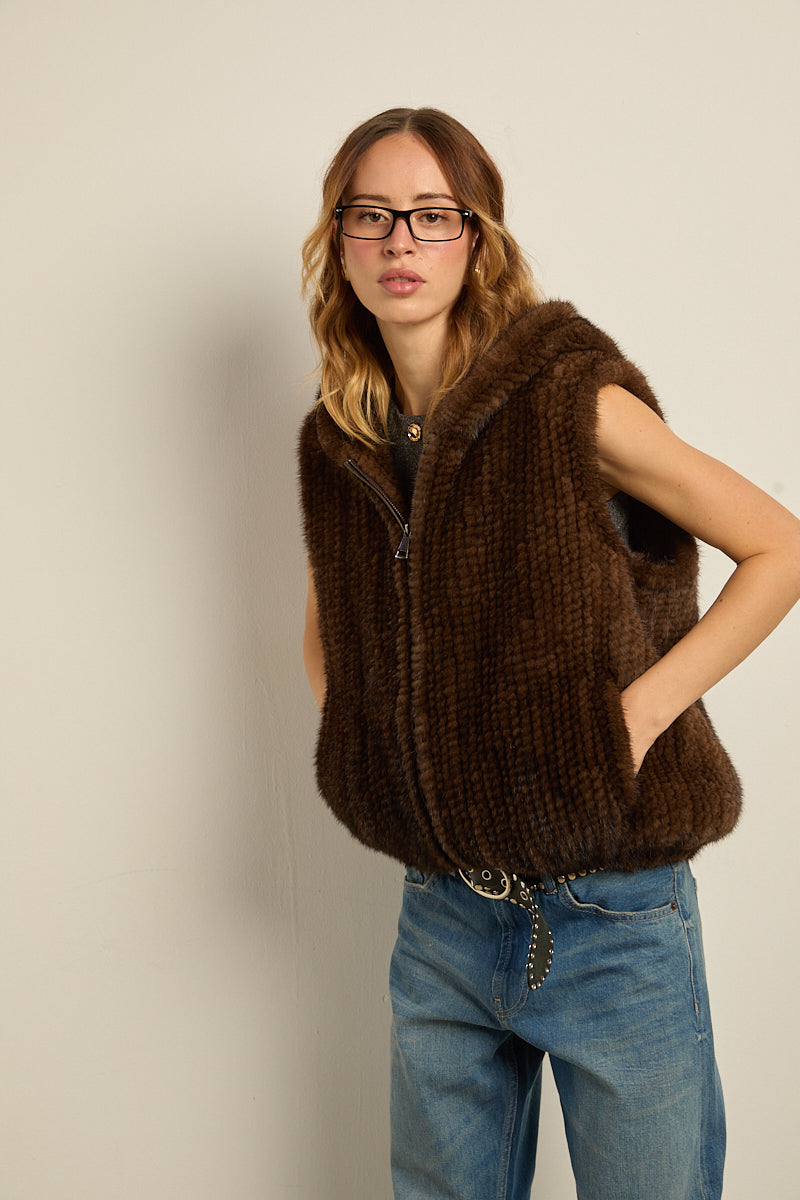 Chaleco con capucha de piel natural de visón tricotado color marrón demi. Cierre con cremallera y bajo abullonado elástico. Bolsillos laterales.
