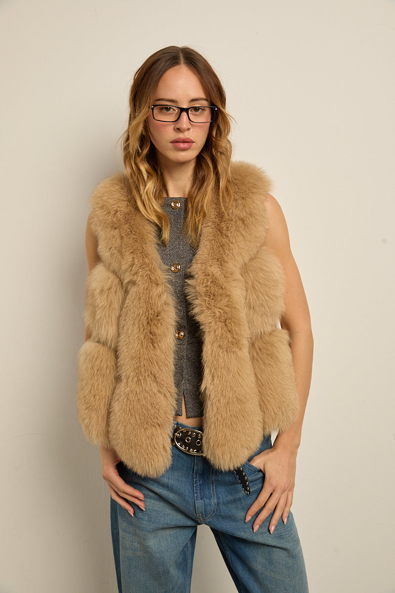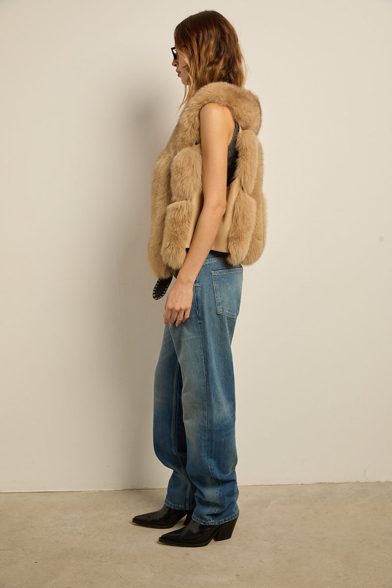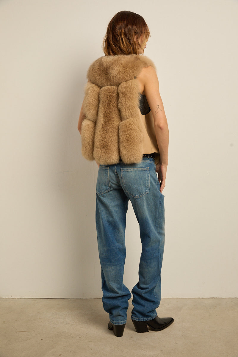 Chaleco de zorro natural camel y lateral de cuero. Ganchos invisibles para cierre. Bolsillos laterales.