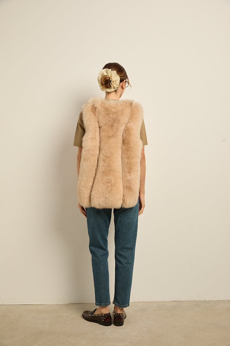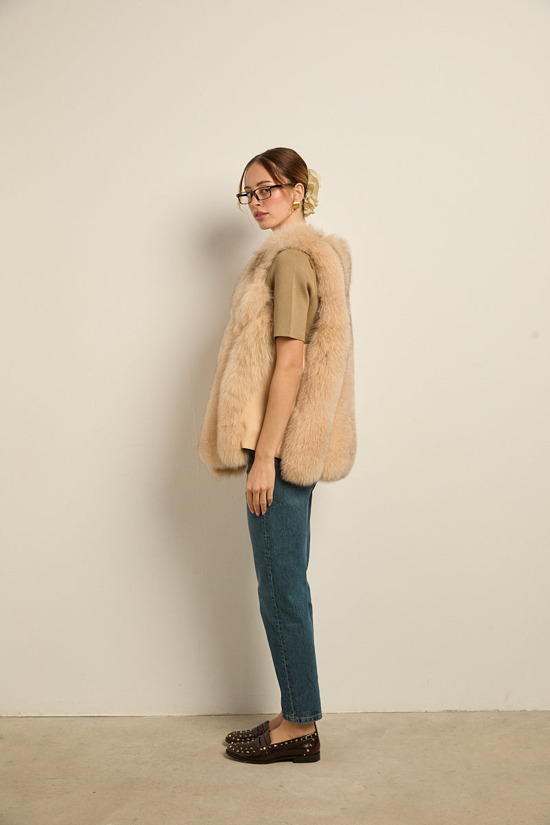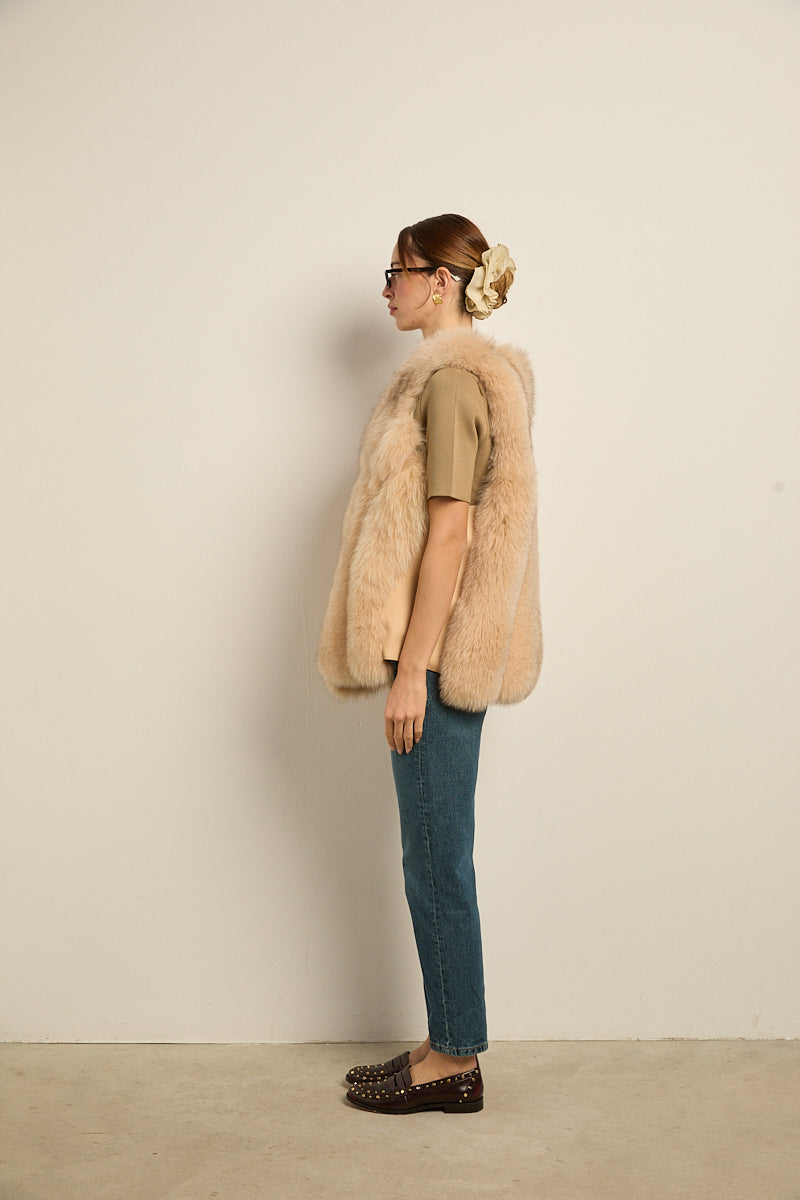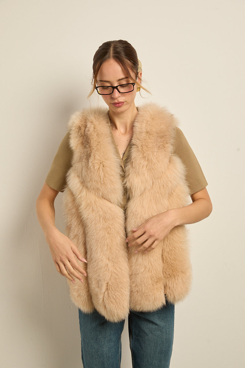 Chaleco de zorro natural beige y lateral de cuero. Ganchos invisibles para cierre. Bolsillos laterales.