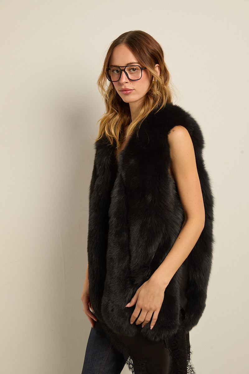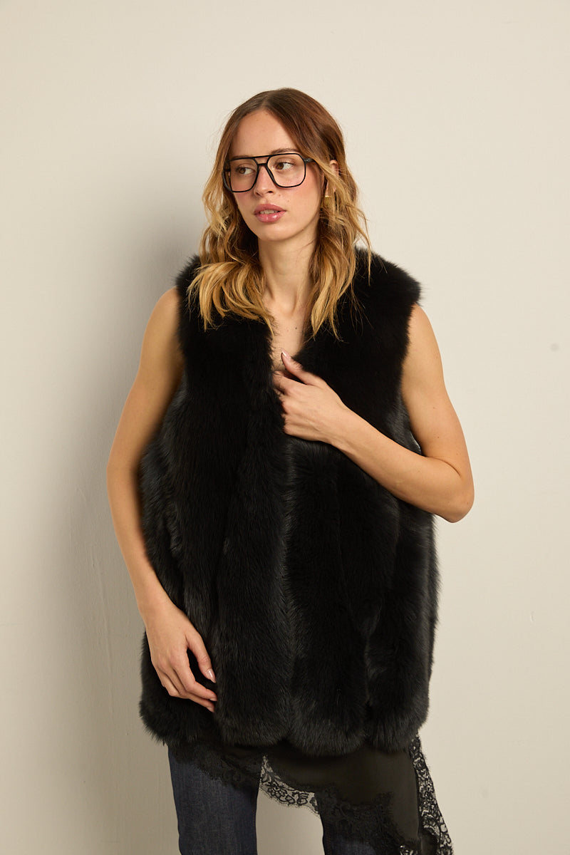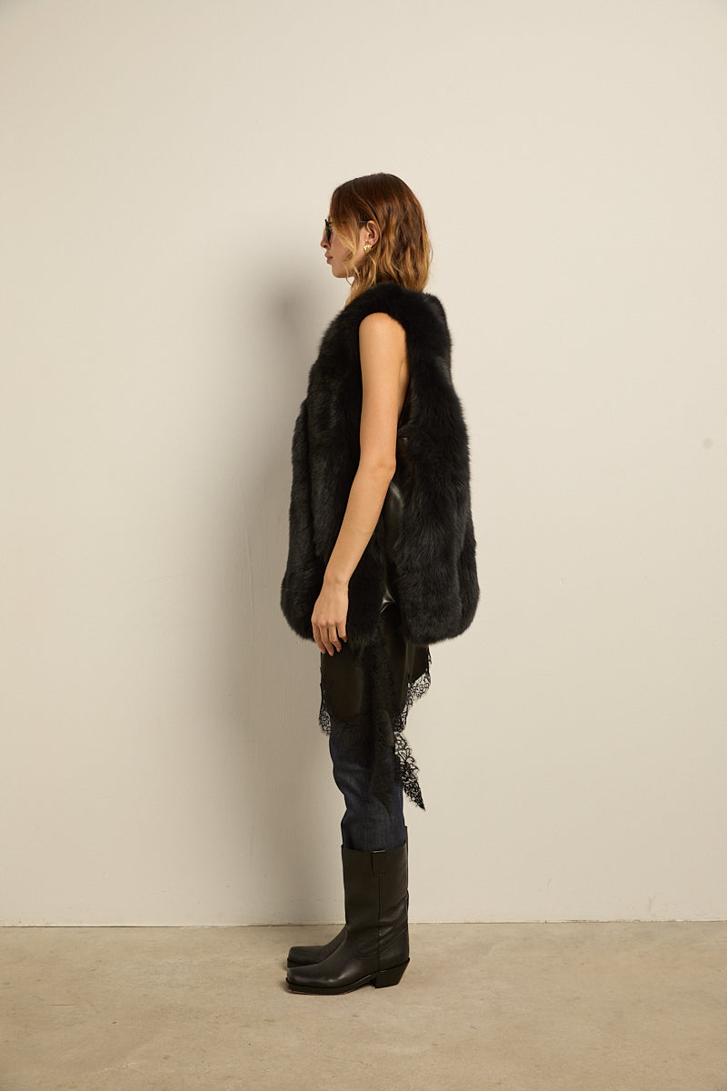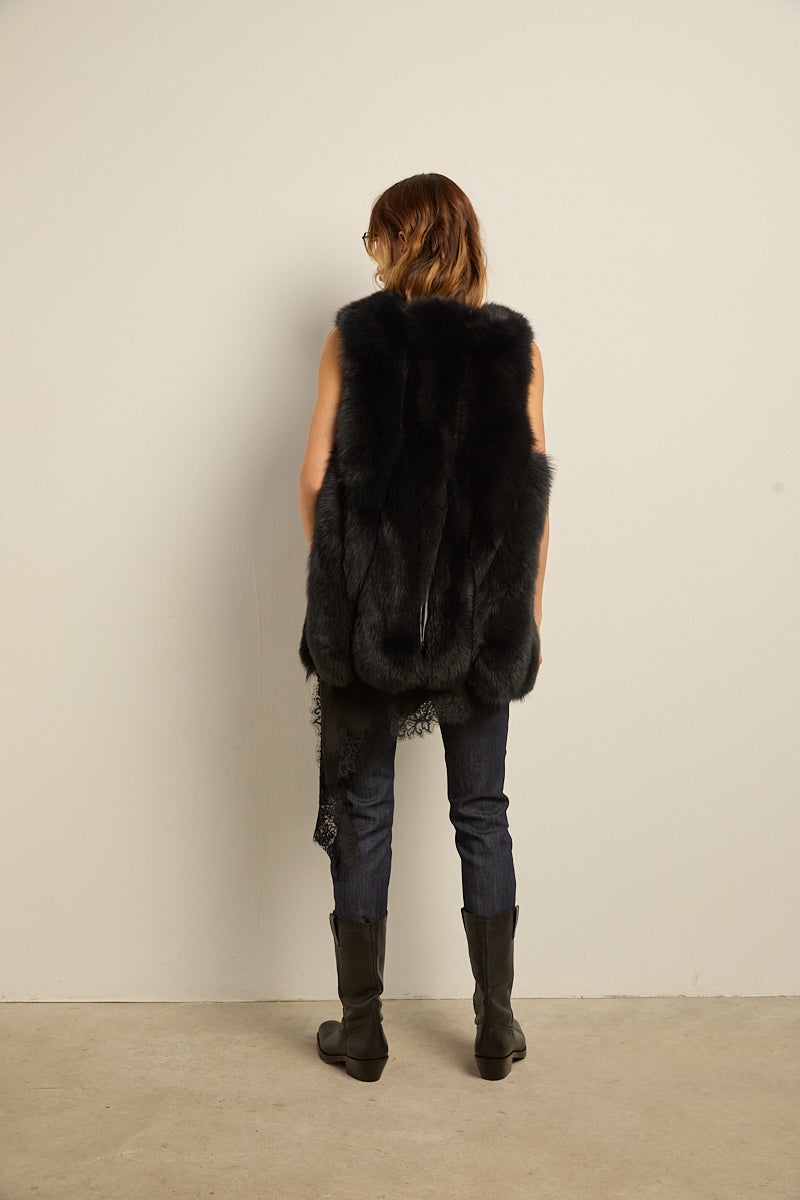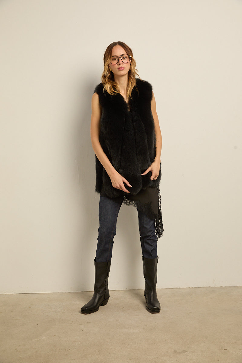 Chaleco de zorro natural gris plomo y lateral de cuero. Ganchos invisibles para cierre. Bolsillos laterales.