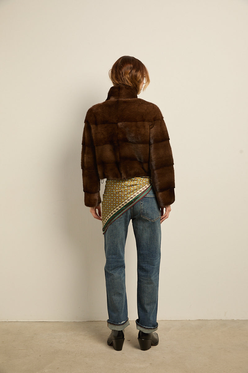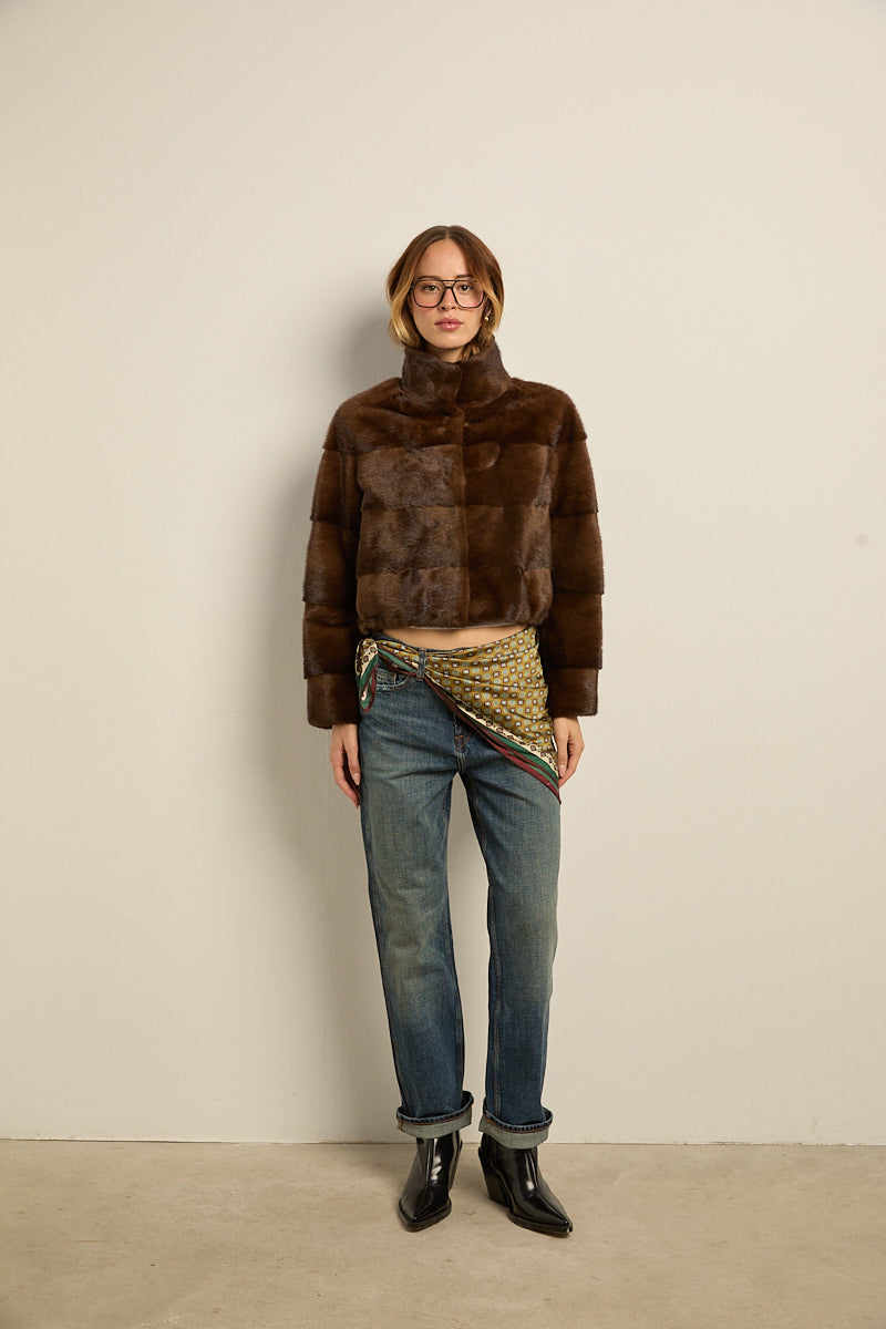 Chaqueta de piel de visón en color demi natural. Fruncido interior para abullonar.