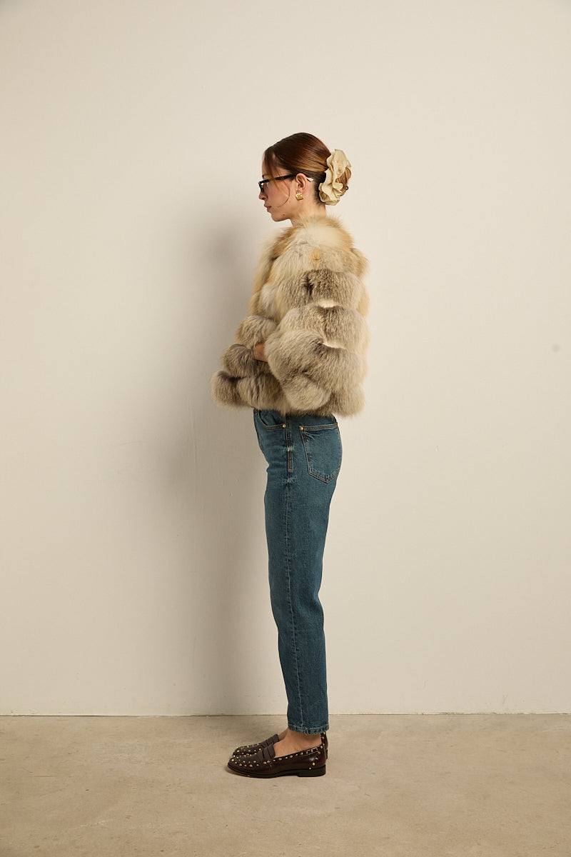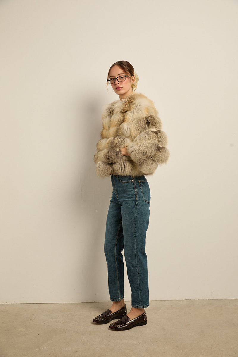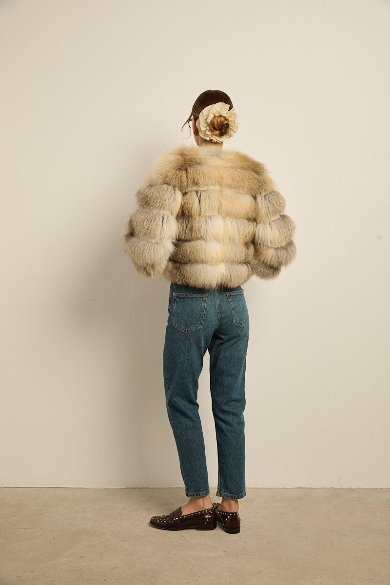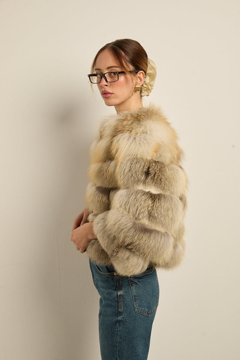 Chaqueta de zorro color natural golden island y franjas de cuero.
